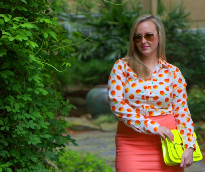 Colorful prints have been a big hit this spring whether it’s lemons, palm fronds, and even flamingos! Me personally, I went for JCrew Factory’s less expensive version of the citrus print from a couple of years ago. It’s bright, cheery, and close enough to a polka dot print that it doesn’t feel too crazy for work. Weirdly, or perhaps not given my penchant for all things bright and ostentatious, I reach for this shirt more for the working hours than for my off hours. And since it tends to put me in a chipper mood, I can’t help but pair it with bright pinks and neon yellows.